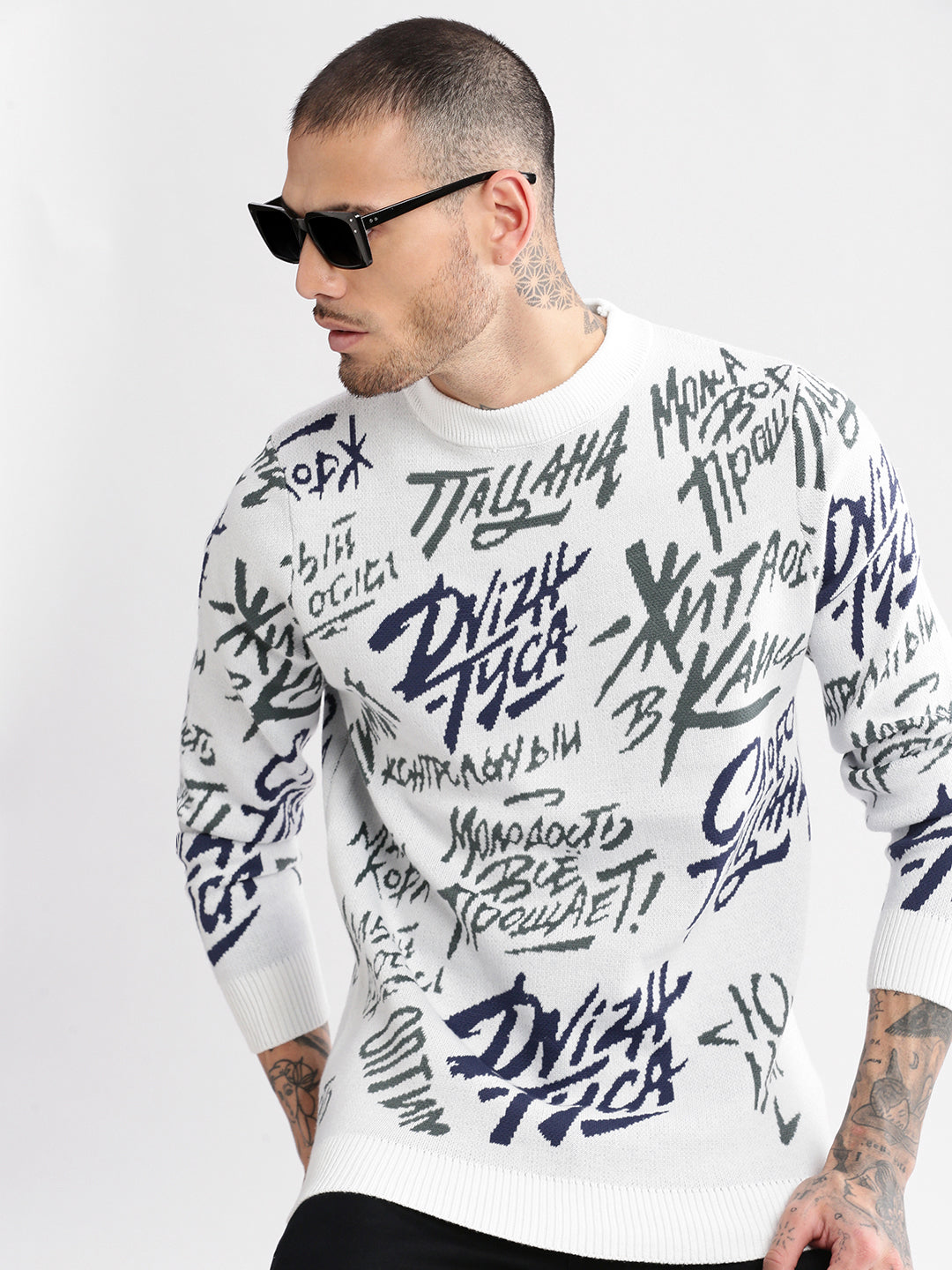 Men Grey Typography Printed Acrylic Pullover Sweater Modern Street Look