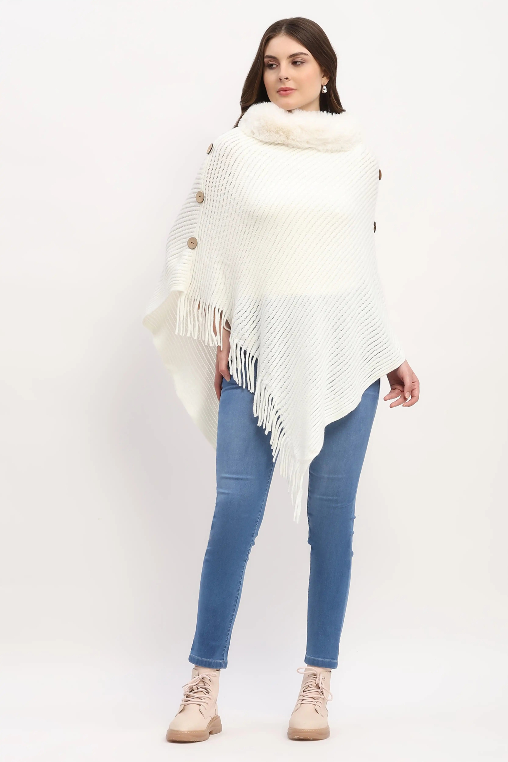 Add to WishlistAdd warmth and elegance to your winter wardrobe with this Off White winter poncho, crafted from 100% acrylic for a soft, lightweight and cozy feel. Featuring fur lining around the neckline, big wooden buttons for a stylish accent and fringes along the asymmetric hemline, this hip length, loose fit, kaftan style poncho with elbow length sleeves and high neck combines casual sophistication with comfort. The self design stripe pattern adds subtle texture, making it a versatile layering piece for any winter outing.