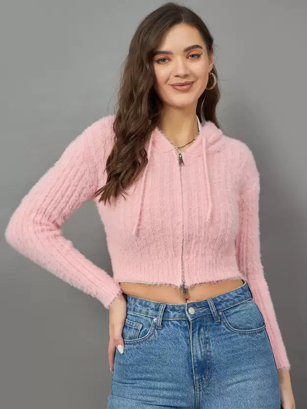 Pink Woolen Zipper Cardigan Jacket for Women Winter Comfort Wear