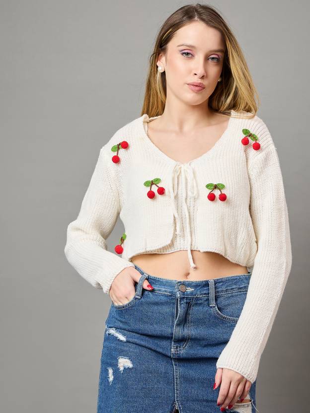 White Embroidered Cherry Cardigan for Women Cute Cozy Layer